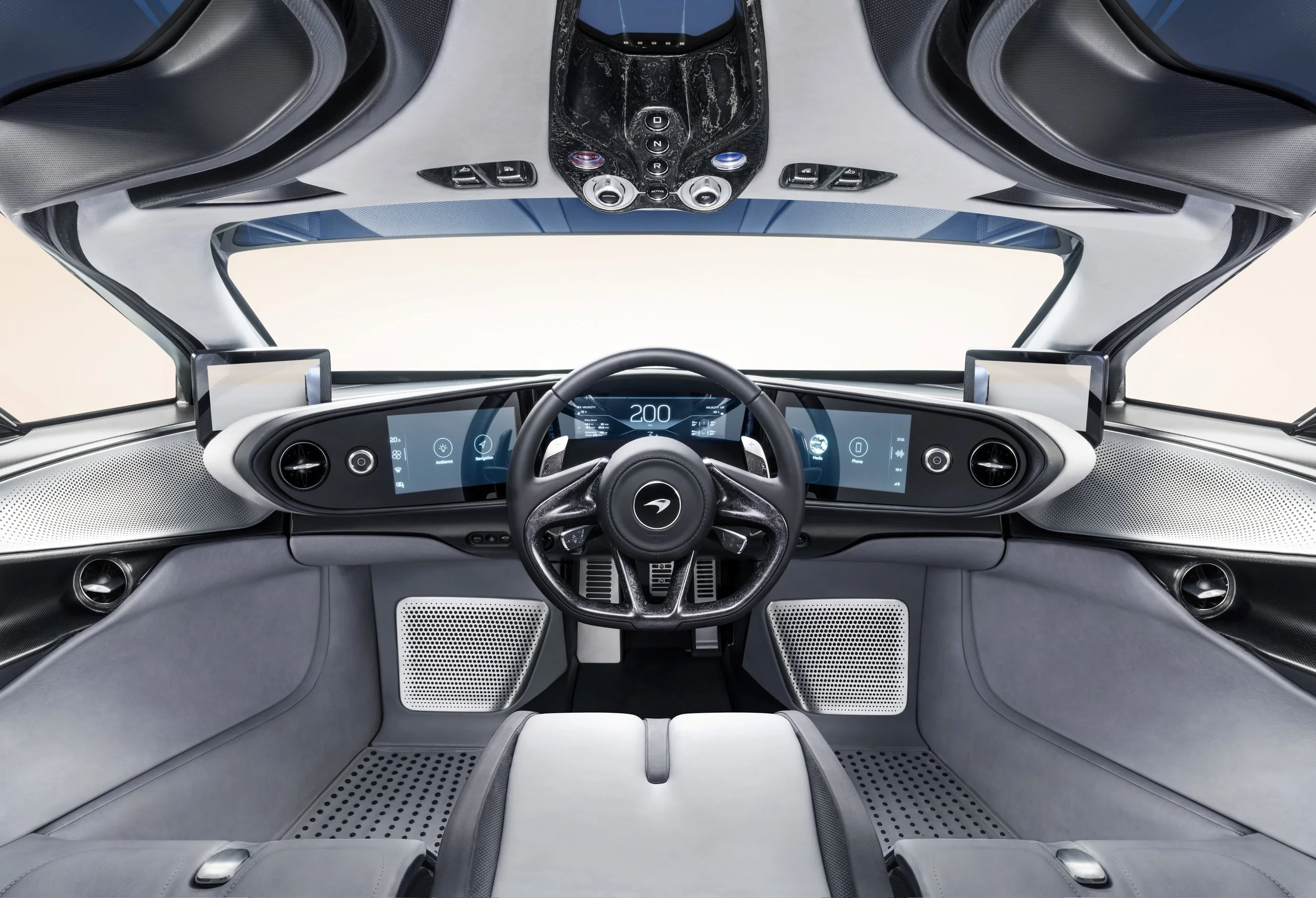 One of the coolest things I love about the original McLaren F1 is that iconic central seating position, the Speedtail borrows from this unusual seating arrangement with 2 passenger seats either side. The F1 was also known for the use of some extremely exotic materials like gold for lining the engine bay and of course carbon fibre, the speedtail takes this further with some seriously exotic material like something called aniline leather, if you hate buttons then you'll be pleased to know McLaren swapped them out for touch screens which surround the dashboard.